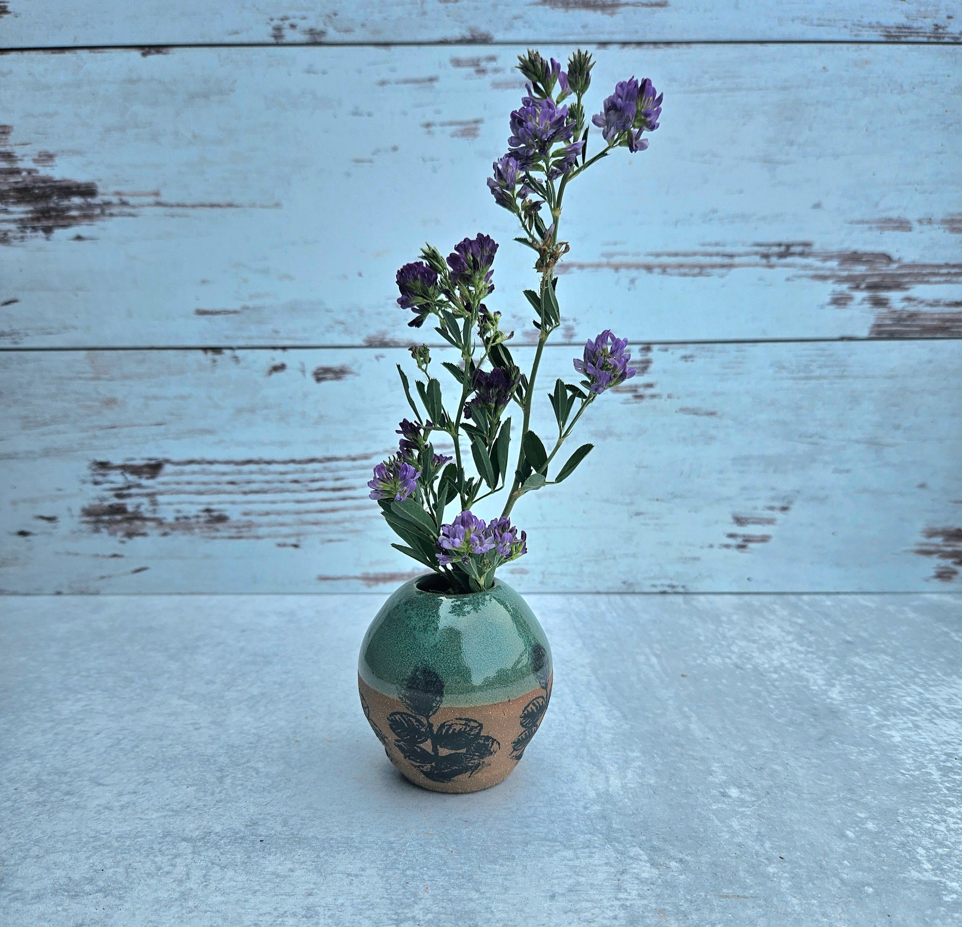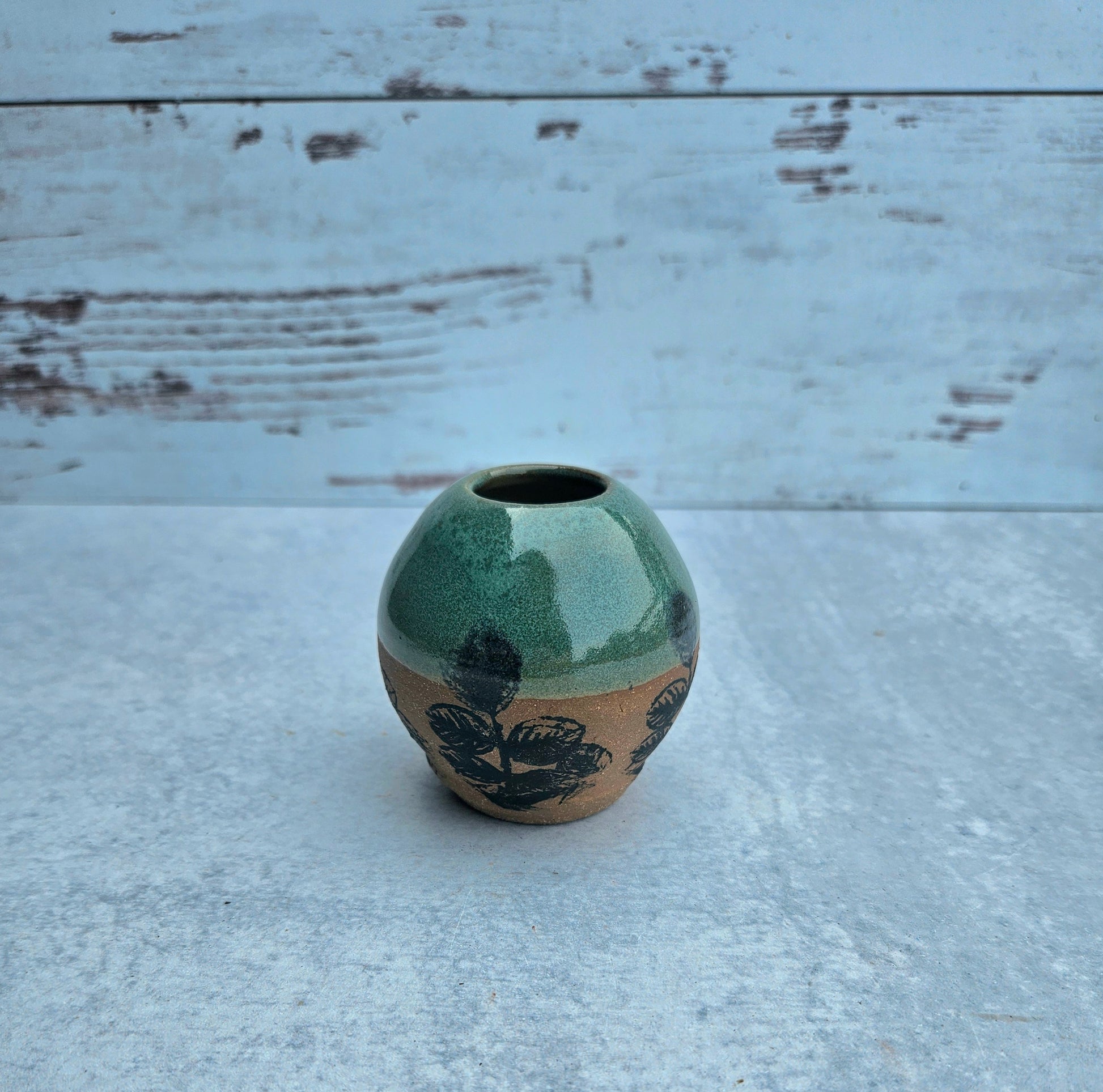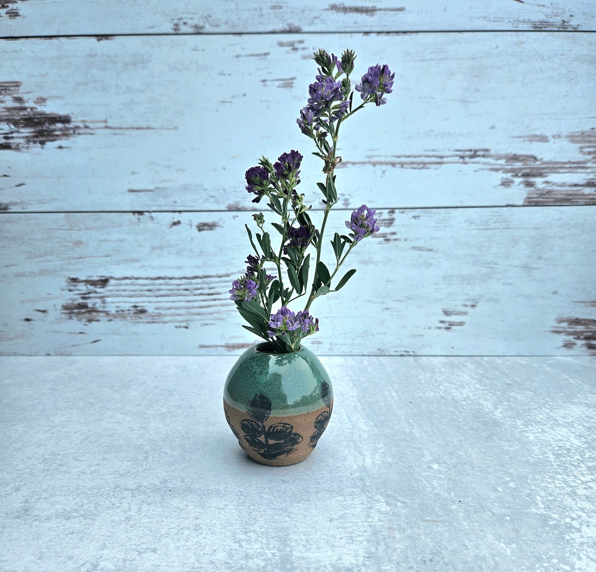 This cute little bud vase is perfect for gathered wild flowers, dandelions, or dried arrangements. It also is happy to hold tooth picks, q-tips, or bobby pins on your counter top.