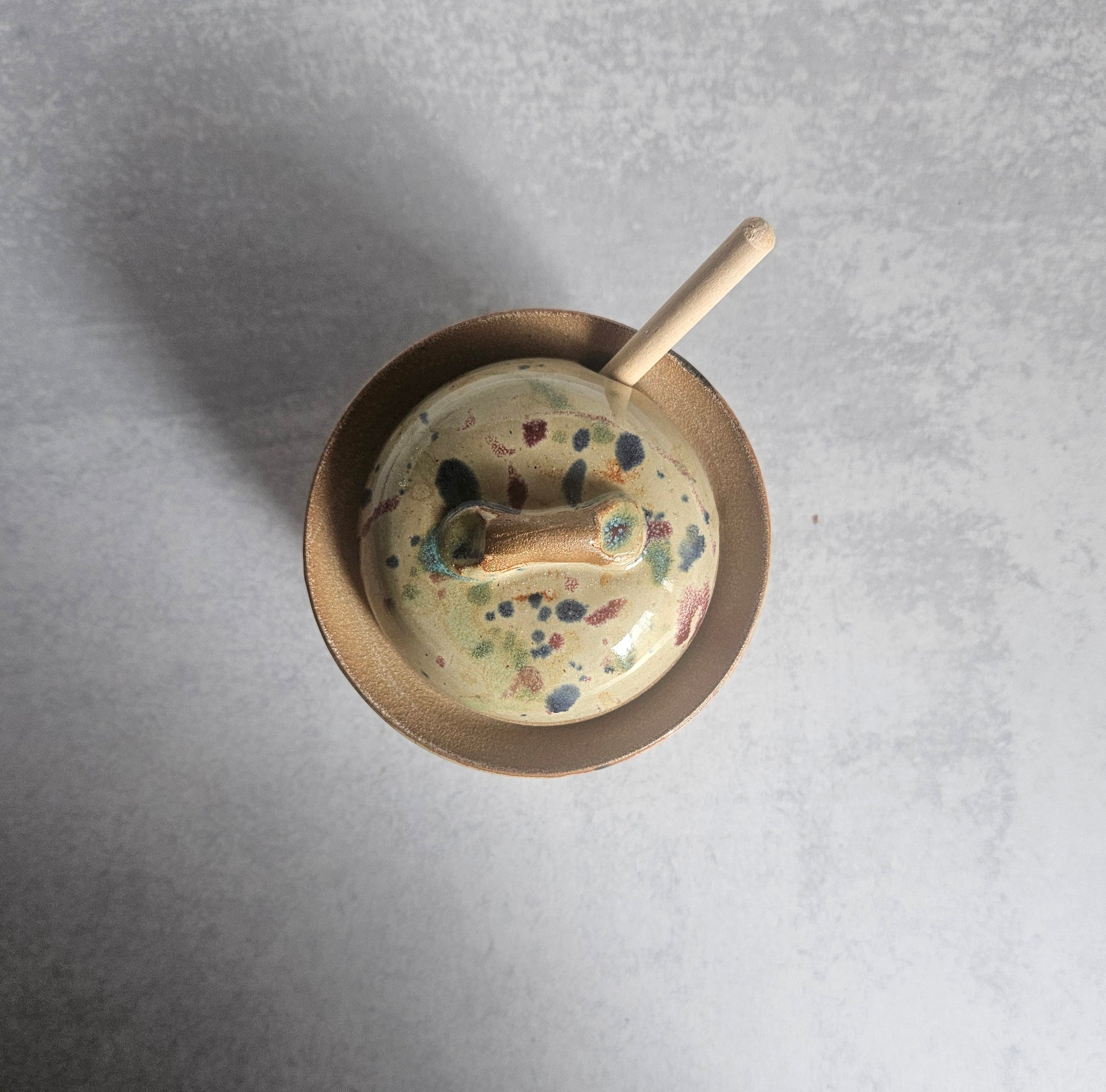 This charming pottery honey pot brings a rustic yet elegant touch to any kitchen. Crafted from midfire clay and glazed in a warm, earthy tone, it’s the perfect home for your honey. The smooth, rounded design is both functional and beautiful, offering an easy-to-use dipper for effortless serving.